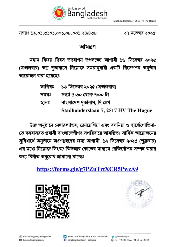 এ প্রেক্ষিতে নেদারল্যান্ডস, ক্রোয়েশিয়া এবং বসনিয়া ও হার্জেগোভিনাতে বসবাসরত প্রবাসী বাংলাদেশি নাগরিকদের আগামী ২৭ নভেম্বর ২০২৫ থেকে ১৮ ডিসেম্বর ২০২৫ পর্যন্ত (বাংলাদেশ সময়) সময়সীমার মধ্যে নিবন্ধন সম্পন্ন করার জন্য দূতাবাস আন্তরিকভাবে অনুরোধ জানাচ্ছে।