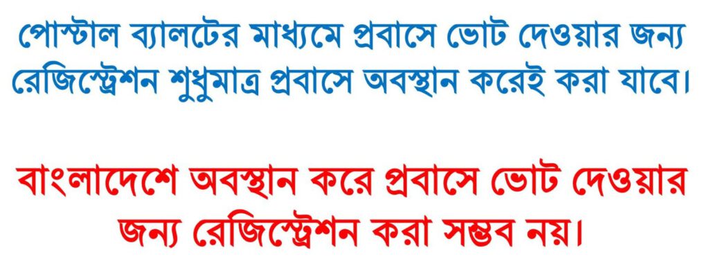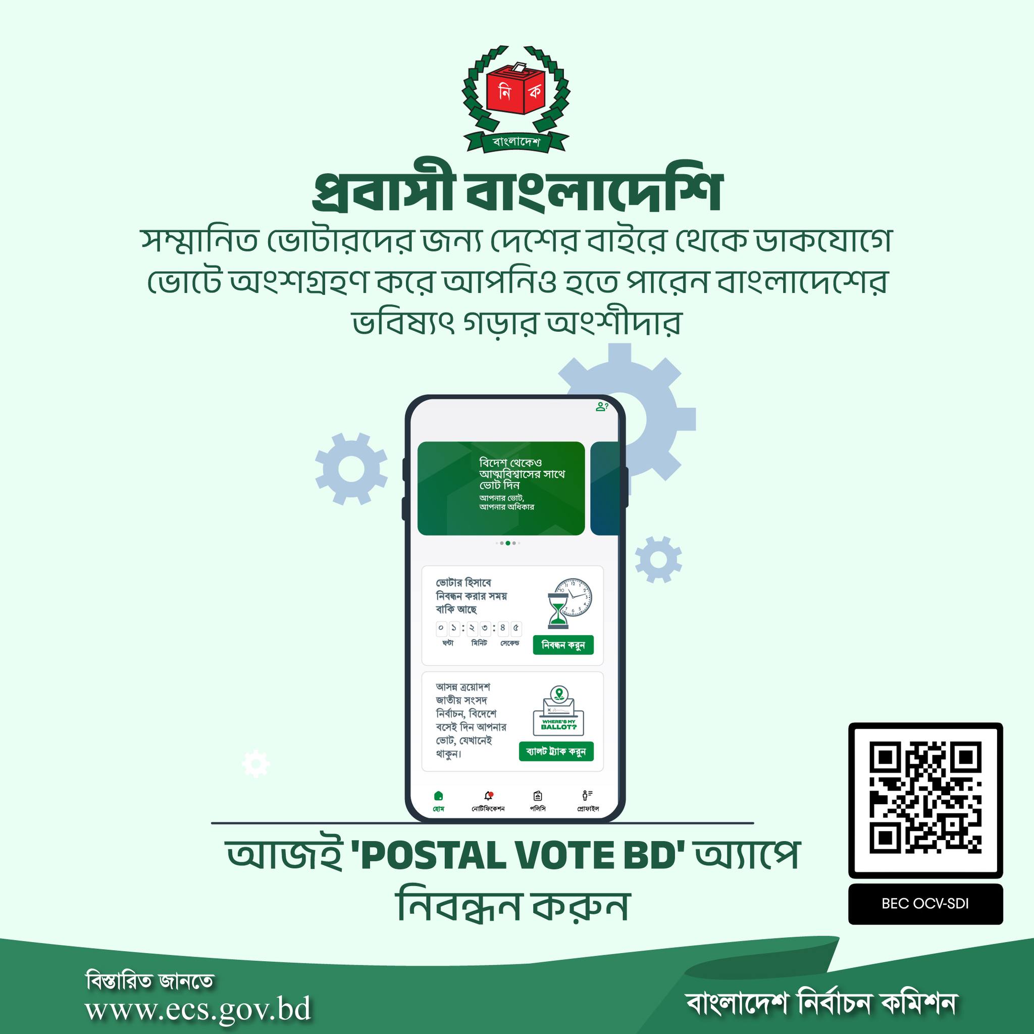 নির্বাচন কমিশন কর্তৃক নির্ধারিত সময়সূচি অনুযায়ী বিভিন্ন দেশে বসবাসরত প্রবাসী বাংলাদেশিগণ Postal Vote BD অ্যাপে নিবন্ধন প্রক্রিয়া সম্পাদন করতে পারবেন। প্রবাসী বাংলাদেশিগণ 'গুগল প্লে স্টোর' অথবা 'অ্যাপল অ্যাপ স্টোর'- এ গিয়ে Postal Vote BD লিখে সার্চ করে অ্যাপটি ডাউনলোড করতে পারবেন। নিবন্ধন সংক্রান্ত প্রয়োজনীয় নির্দেশনা জানতে বাংলাদেশ দূতাবাস, দি হেগ, নেদারল্যান্ডস-এর ওয়েবসাইট, ফেইসবুক পেইজ, নির্বাচন কমিশনের ওয়েবসাইটসহ নিম্মলিখিত সোস্যাল মিডিয়া প্লাটফর্মে নজর রাখুন।