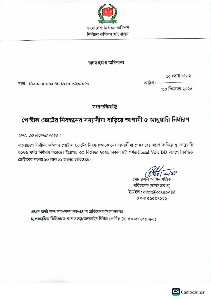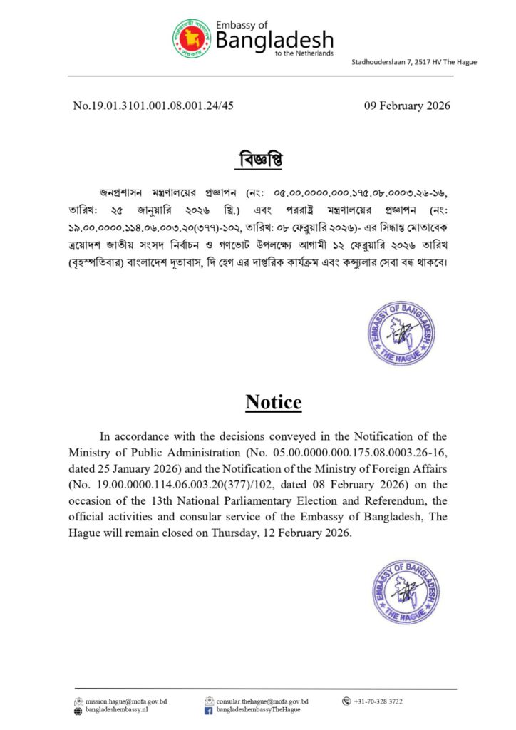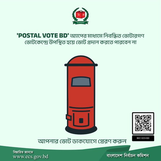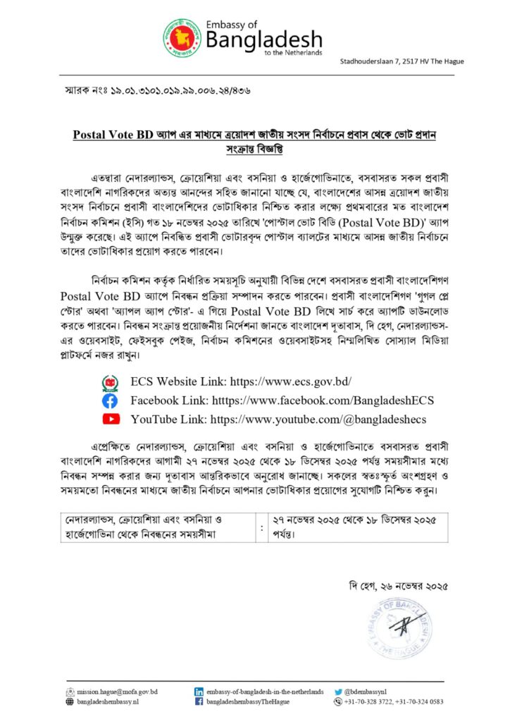 এতদ্বারা নেদারল্যান্ডস, ক্রোয়েশিয়া এবং বসনিয়া ও হার্জেগোভিনাতে, বসবাসরত সকল প্রবাসী বাংলাদেশি নাগরিকদের অত্যন্ত আনন্দের সহিত জানানো যাচ্ছে যে, বাংলাদেশের আসন্ন ত্রয়োদশ জাতীয় সংসদ নির্বাচনে প্রবাসী বাংলাদেশিদের ভোটাধিকার নিশ্চিত করার লক্ষ্যে প্রথমবারের মত বাংলাদেশ নির্বাচন কমিশন (ইসি) গত ১৮ নভেম্বর ২০২৫ তারিখে 'পোস্টাল ভোট বিডি (Postal Vote BD)' অ্যাপ উন্মুক্ত করেছে। এই অ্যাপে নিবন্ধিত প্রবাসী ভোটারবৃন্দ পোস্টাল ব্যালটের মাধ্যমে আসন্ন জাতীয় নির্বাচনে তাদের ভোটাধিকার প্রয়োগ করতে পারবেন।