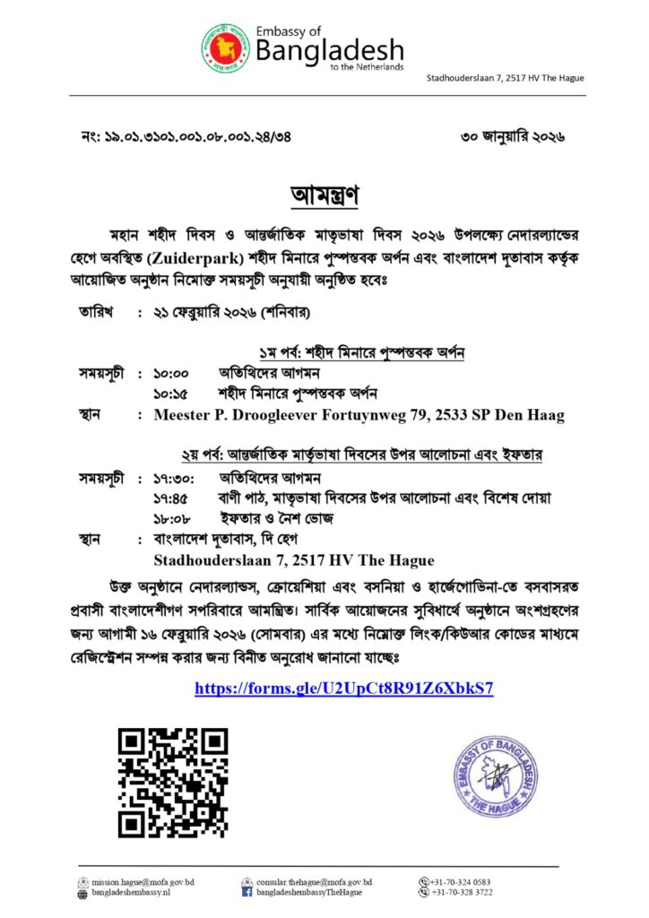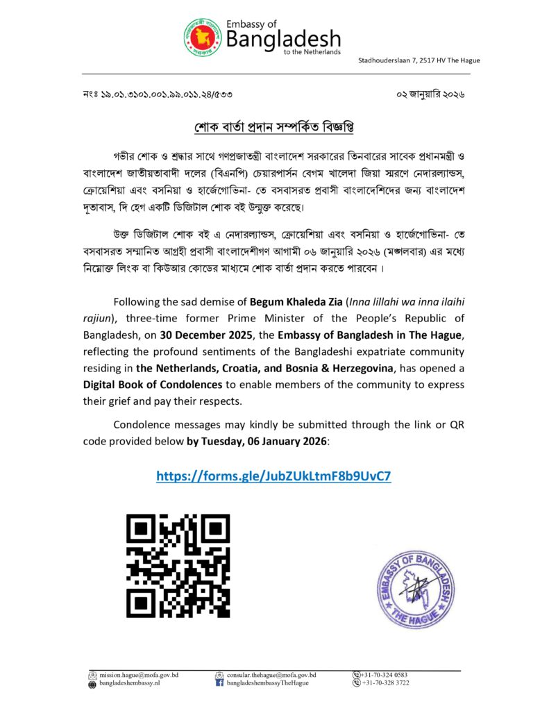এ প্রেক্ষিতে নেদারল্যান্ডস, ক্রোয়েশিয়া এবং বসনিয়া ও হার্জেগোভিনাতে বসবাসরত প্রবাসী বাংলাদেশি নাগরিকদের আগামী ০৫ জানুয়ারি ২০২৬ পর্যন্ত (বাংলাদেশ সময়) সময়সীমার মধ্যে নিবন্ধন সম্পন্ন করার জন্য দূতাবাস আন্তরিকভাবে অনুরোধ জানাচ্ছে।