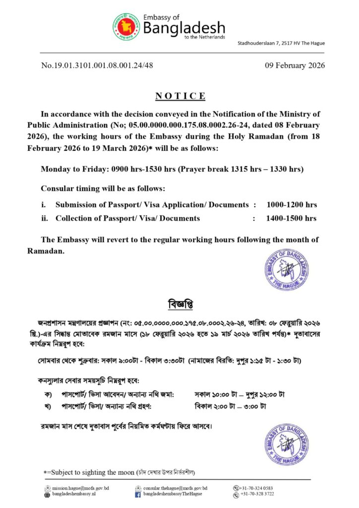 Mr. Shekhar Mojumder, Phone: +31-70-328-3722, E-mail: consular.thehague@mofa.gov.bd