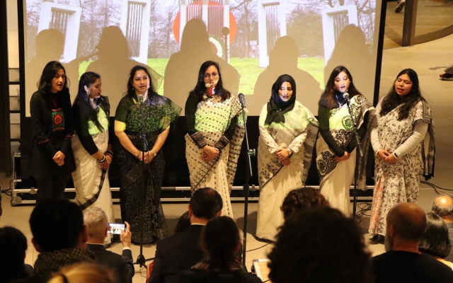 The spouses of Bangladesh Embassy officials rendered the immortal song, ‘Amar Bhaier Rokte Rangano Ekushe February…’.